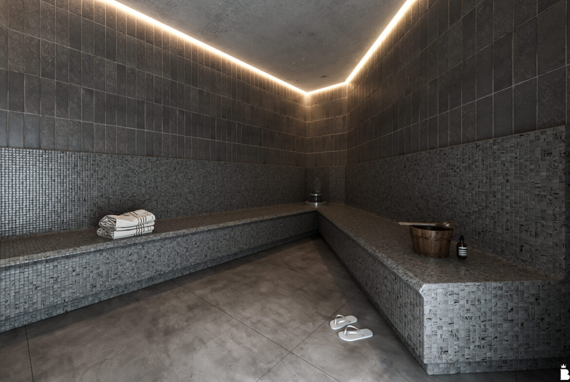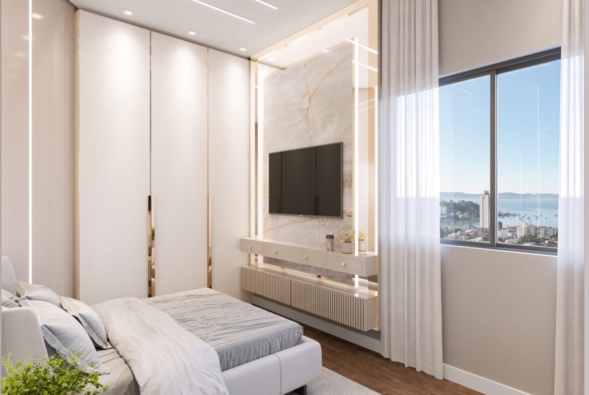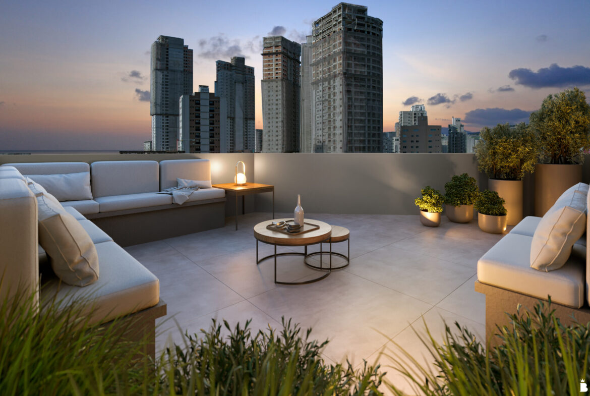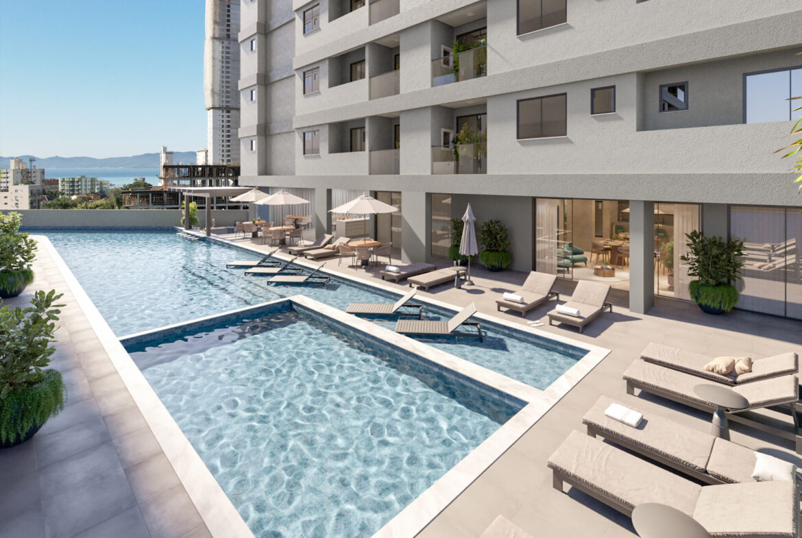 As opções de entretenimento incluem salão de festas, pub com churrasqueira, brinquedoteca, sala de jogos, coworking e espaço gourmet. A área externa conta com piscina adulto e infantil, bar molhado, playground e quadra poliesportiva, proporcionando diferentes opções de lazer para os moradores. O projeto também contempla terraços com lareiras e espaços gourmets garantem maior conforto e segurança para os residentes. A arquitetura busca integrar formas orgânicas e assimétricas ao design contemporâneo, valorizando a interação com o entorno e utilizando materiais que respeitam o ambiente. A influência minimalista nos acabamentos reforça a funcionalidade e a sofisticação nos espaços.